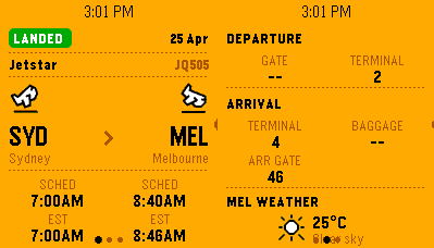 Flights app is rather useful when travelling. Input your flight number and get all the details. Here's a Jetstar flight from Sydney to Melbourne. Gives you the weather at destination. Pretty handy to have all on your wrist.