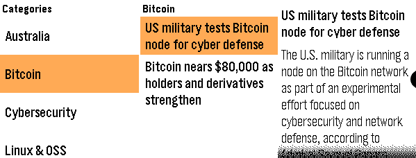 Kagi News keeps you up to date on a range of topics you can choose from. Data is refreshed at 10pm every night, ready for your morning brew. Here are the ones I'm interested in and a sample of news provided.
