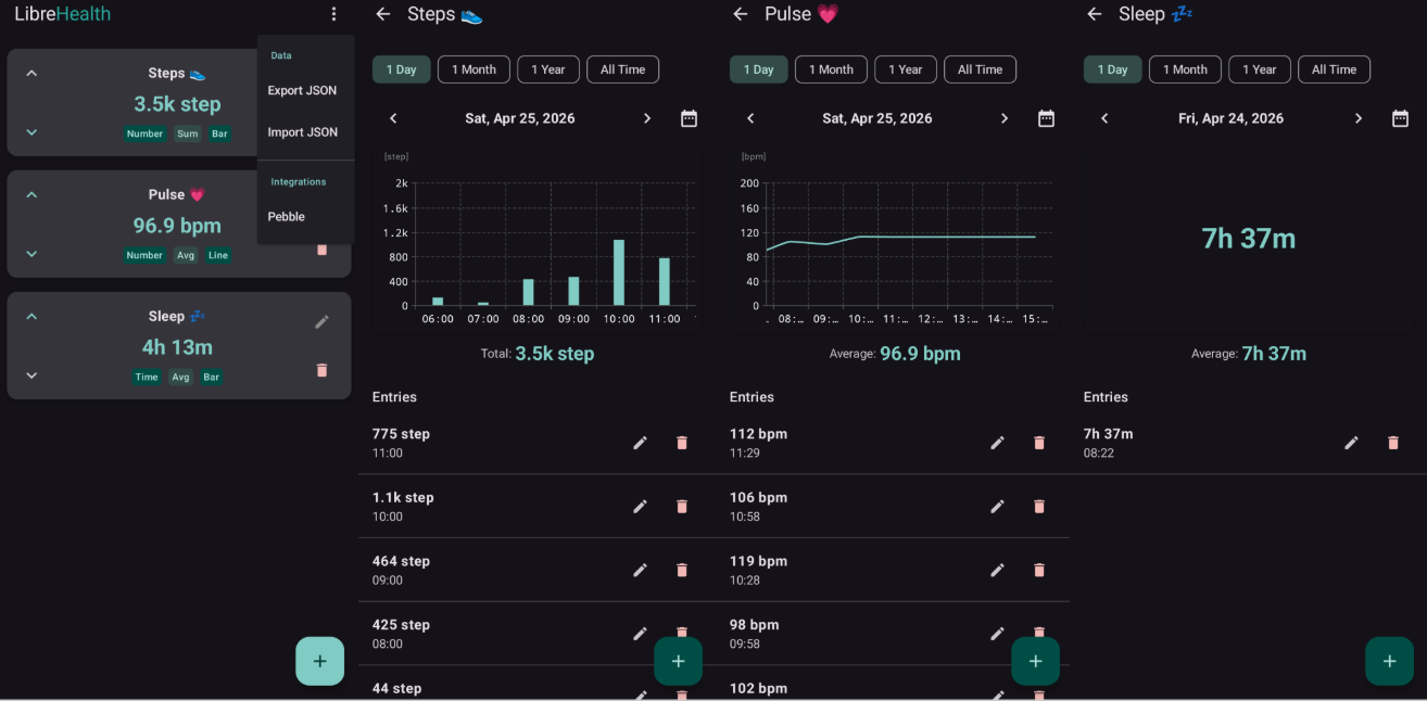 LibreHealth sends health related data (steps, pulse, sleep) collected by your Pebble watch every hour to its companion mobile phone app called LibreHealth. From there, you can export/import this information to json file. Both the pebble app and phone app are open source and hosted on GitHub. Your health data does not get uploaded to any servers and is always kept with you. Very impressive.